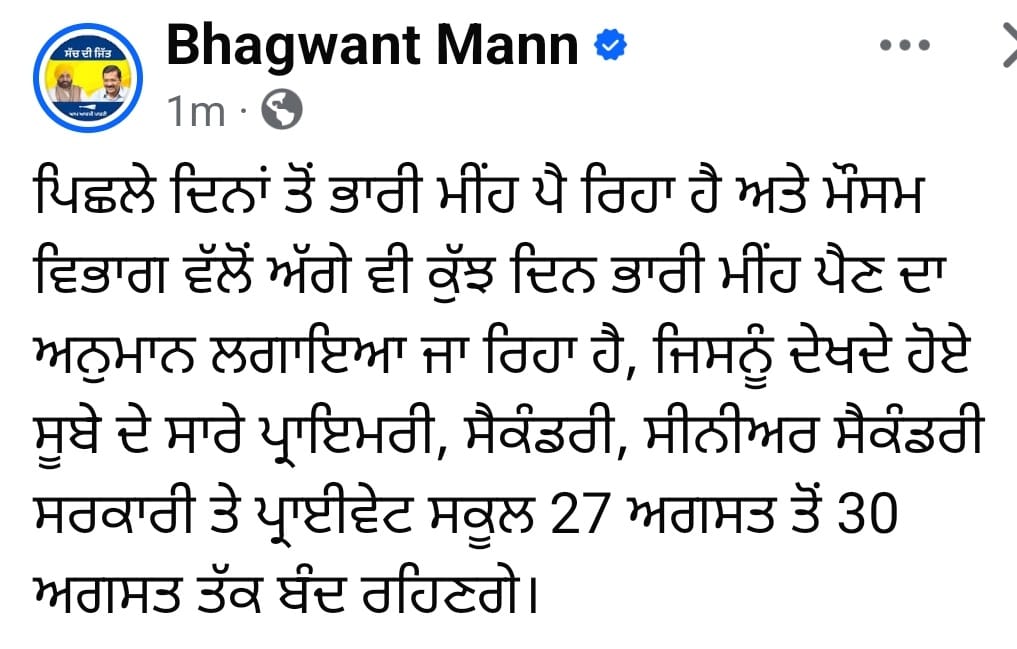 पंजाब, 26 अगस्त 2025। पंजाब के मुख्यमंत्री भगवंत मान ने पंजाब के सभी स्कूलों में 30 अगस्त तक छुट्टियों का ऐलान कर दिया है। मुख्यमंत्री मान ने सोशल मीडिया पर पोस्ट शेयर करते हुए बताया कि पिछले कई दिनों से लगातार भारी बारिश हो रही है और मौसम विभाग ने आगे भी भारी बारिश का अनुमान जताया है। इसी को देखते हुए प्रदेश के सभी सरकारी और निजी प्राइमरी, सेकेंडरी और सीनियर सेकेंडरी स्कूल 27 अगस्त से 30 अगस्त तक बंद रहेंगे।