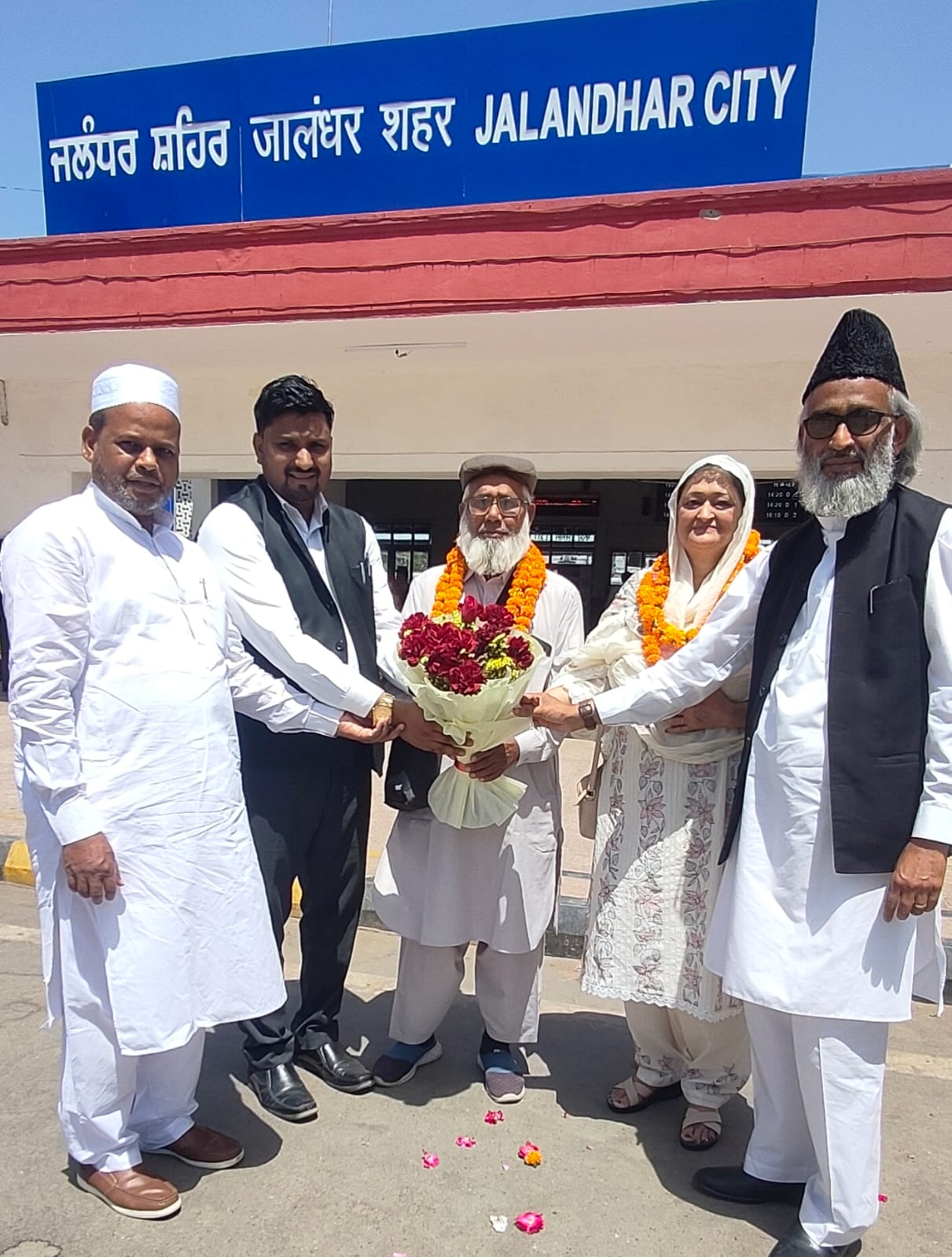 जालंधर, 19 अप्रैल (मजहर): मक्का-मदीना के पवित्र सफर उमरा से वापस लौटे सय्यद मोहम्मद अहमद इलाहाबादी और उनकी पत्नी नोशी नय्यर का आज जालंधर रेलवे स्टेशन पर गर्मजोशी से स्वागत किया गया। इस मौके पर मुस्लिम संगठन पंजाब के प्रधान एडवोकेट नईम खान, जमात-ए- सलमानी ट्रस्ट पंजाब के प्रधान हाजी आबिद हसन सलमानी, मुस्लिम संगठन पंजाब के जनरल सेक्रेटरी, जमीयत उलेमा-ए-हिन्द के जिला प्रधान तथा पंजाब केसरी ग्रुप के पत्रकार मज़हर आलम और वसीम खान सहित कई गणमान्य लोग उपस्थित रहे।